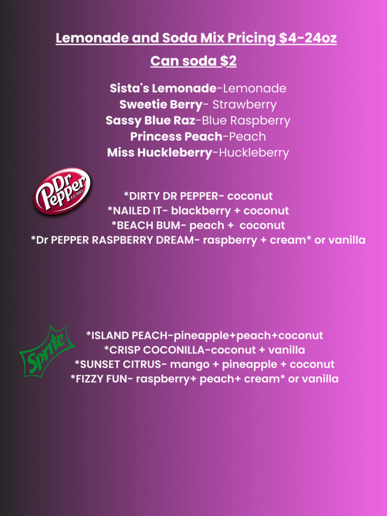 Welcome to our drink selection! Here, you’ll find a taste of our most popular beverages. Each one is crafted to perfection, with unique flavors that capture the essence of fun and refreshment. Try them out and find your new favorite!